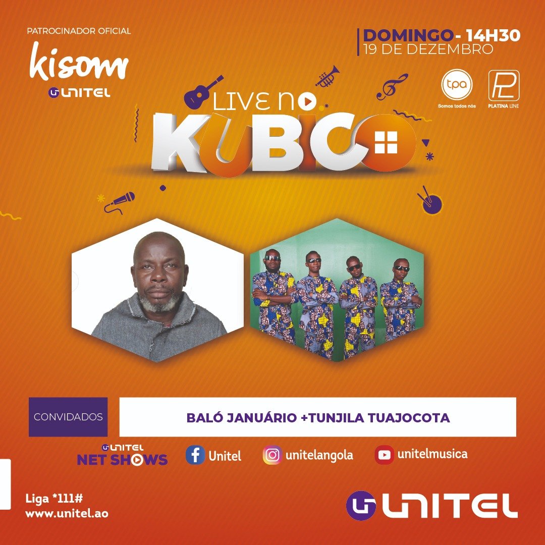 O cantor Baló Januário e o grupo mítico Tunjila Tuajocota serão os cantores convidados para segunda edição do Live no Kubico, neste domingo, pelas 14h30, a ser transmitido no Canal 1 da Televisão Pública de Angola (TPA).