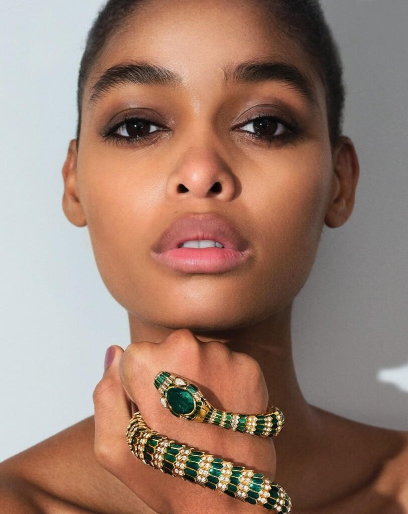 A jovem angolana de 23 anos, é a musa da nova campanha da marca de luxo italiana Bulgari, fotografada pelo Studio Johan Sandberg.
