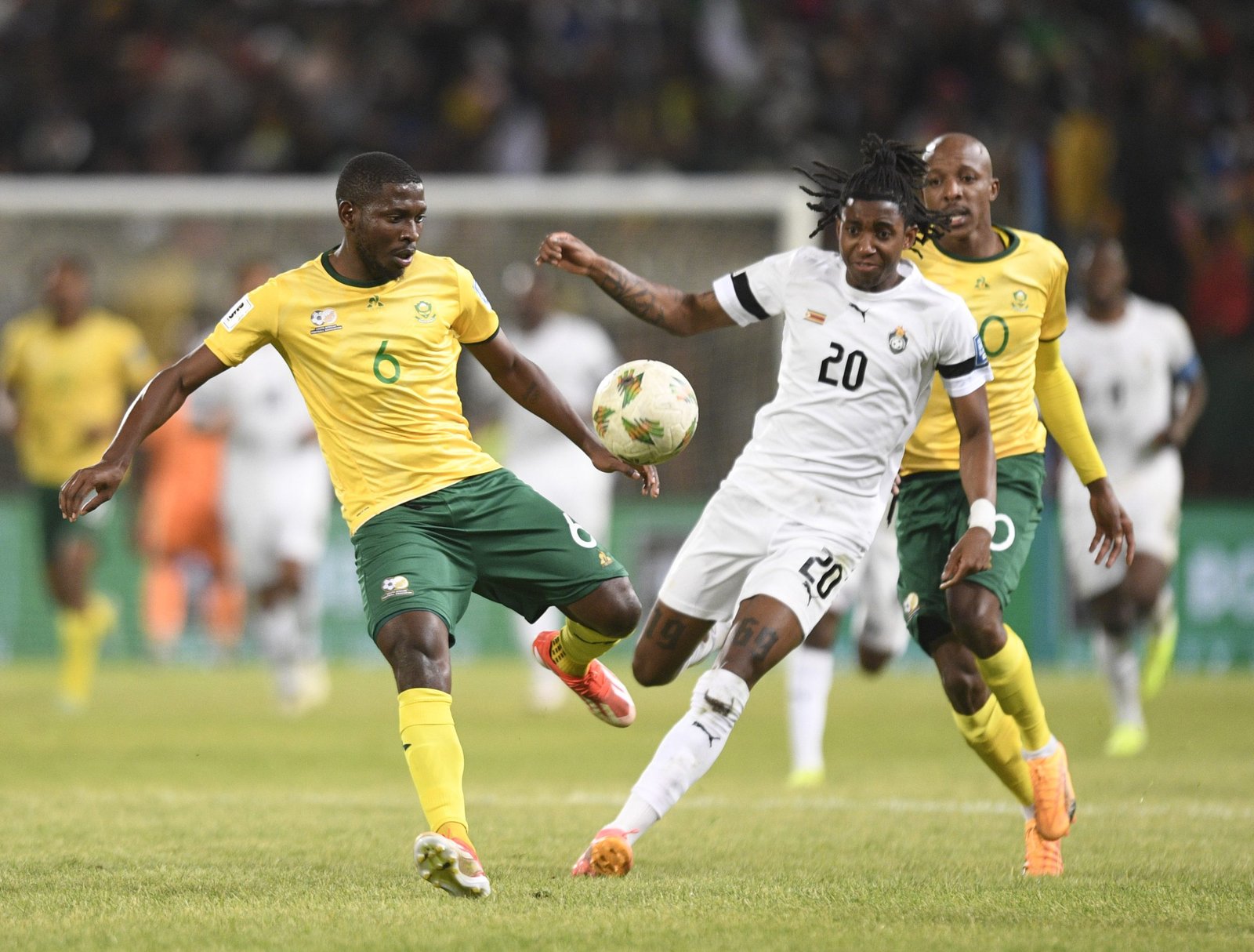 Aubrey Modiba of South Africa challenges Chirewa Tawanda of Zimbabwe during FIFA World Cup Qualifiers 2026 match between South Africa and Zimbabwe at Free State Stadium on the 11 June 2024 in Bloemfontein © Sydney Mahlangu/BackpagePix