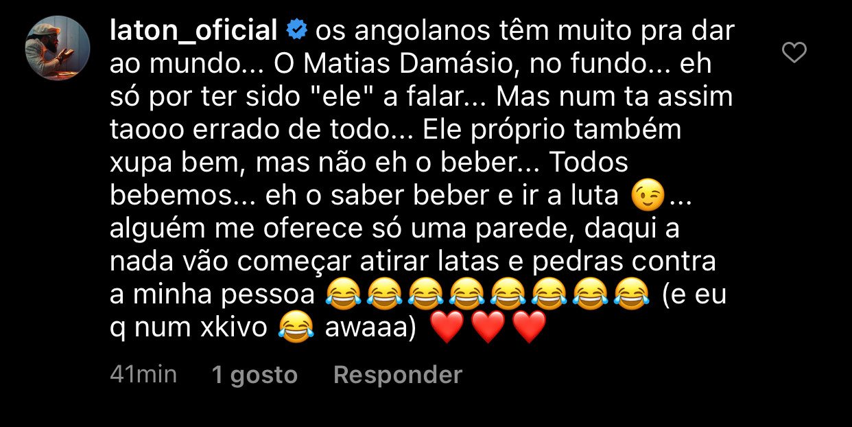Aquando da notícia veiculada pelo PLATINALINE, referente a angolana Alíria da Conceição, de 13 anos de idade, que se sagrou bicampeã mundial de Jiu-Jitsu brasileiro, Laton Cordeiro começou por dizer que os angolanos têm muito para dar ao mundo e referiu que o colega Damásio não está, de todo, errado, porém, lembrou que o autor de “Loucos” também é consumidor de bebidas alcoólicas.