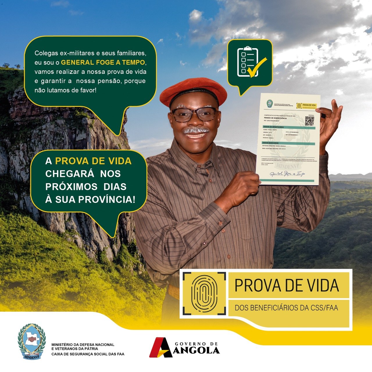 A Direcção Geral da Caixa de Segurança Social das Forças Armadas Angolanas comunica a todos os assistidos do Sistema de Protecção Social das FAA, que à luz do Despacho n.º 0663, de 22 de Julho de 2021, de Sua Excelência Ministro da Defesa Nacional e Veteranos da Pátria, conjugado com o artigo 6.º do Decreto n.º 11-E/96 e o n.º 3 do artigo 7.º do Decreto n.º 11-I/96, ambos de 12 de Abril, decorrerá o processo de prova de vida a partir do dia 01 de Outubro do corrente ano, até ao dia 31 de Janeiro de 2022.