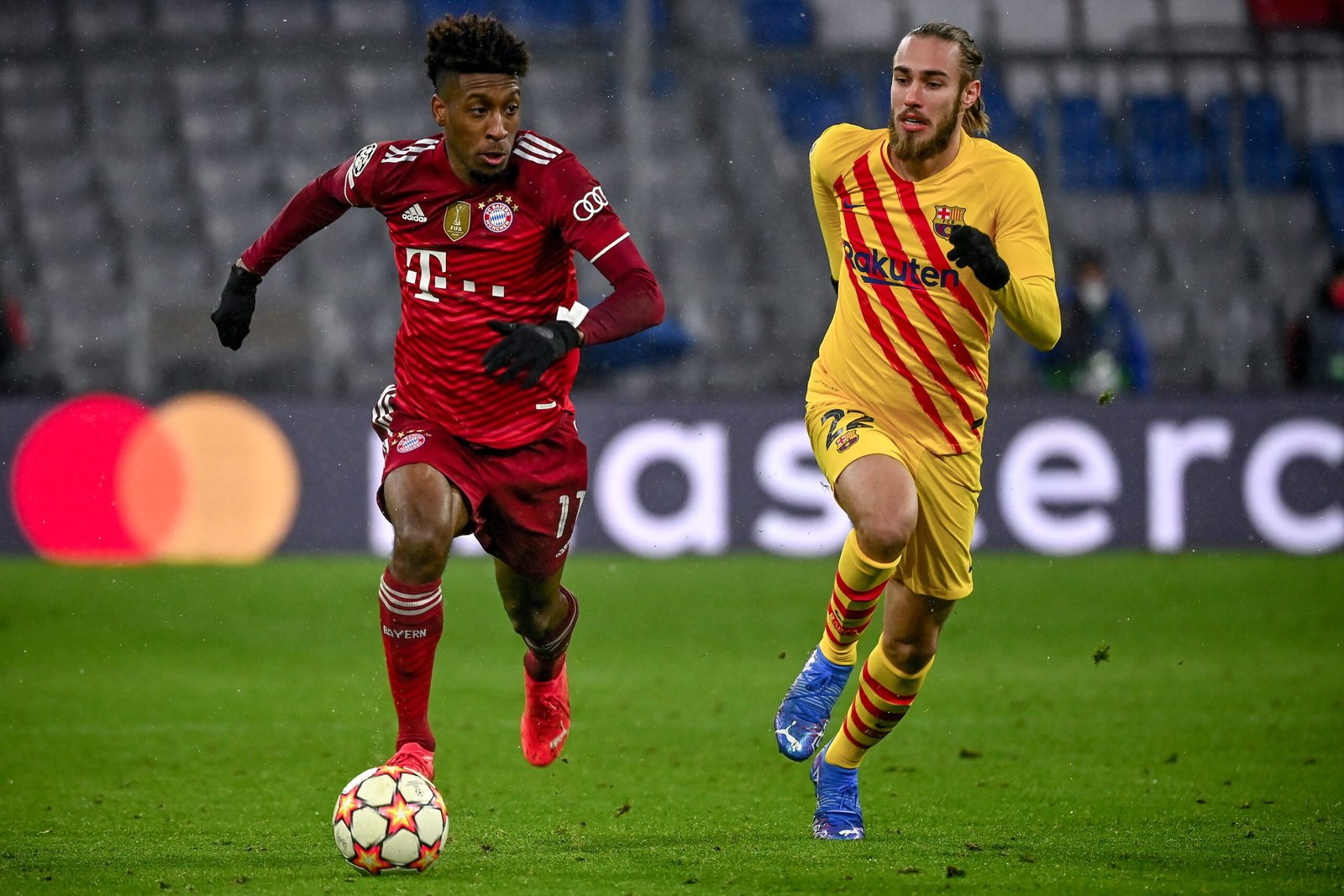 epa09630465 Bayern’s Kingsley Coman (L) in action against Barcelona’s Oscar Mingueza (R) during the UEFA Champions League Group E soccer match between FC Bayern Muenchen and FC Barcelona at Allianz Arena in Munich, Germany, 08 December 2021. EPA/PHILIPP GUELLAND