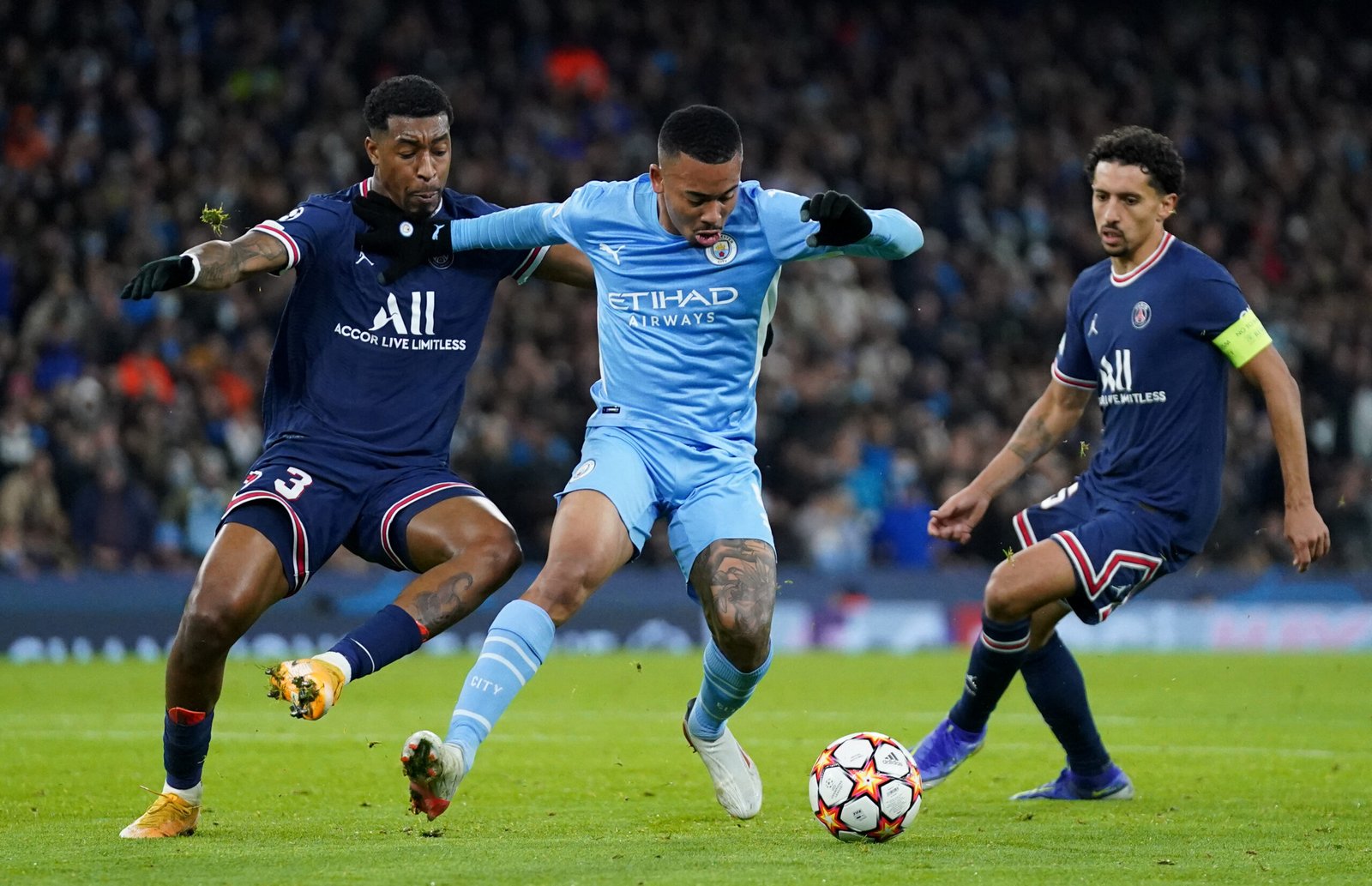 Manchester City’s Gabriel Jesus (centre) battles with Paris Saint-Germain’s Presnel Kimpembe (left) during the UEFA Champions League, Group A match at the Etihad Stadium, Manchester. Picture date: Wednesday November 24, 2021.