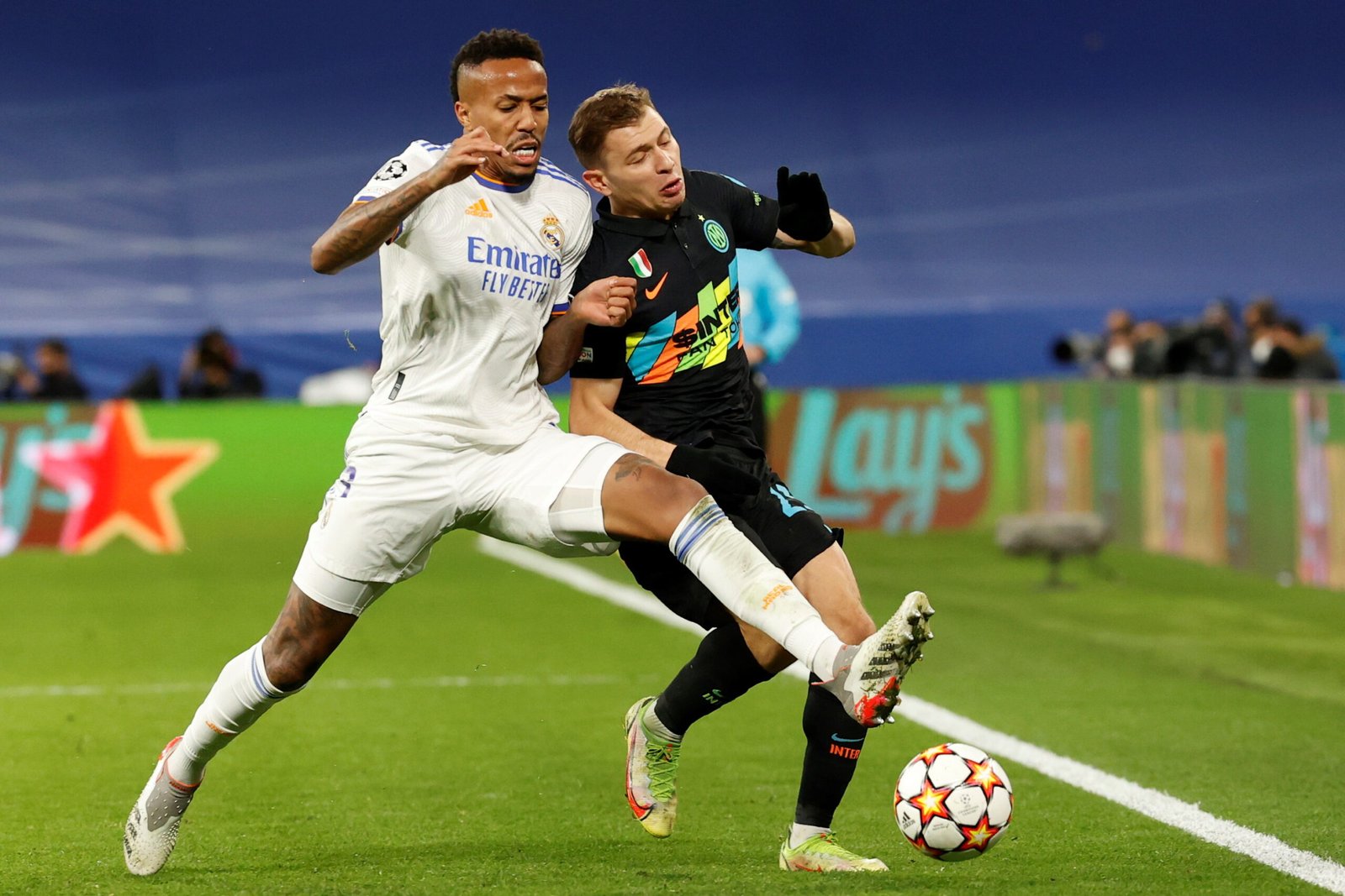 epa09628131 Real Madrid’s defender Eder Militao (L) in action against Inter’s midfielder Nicolo Barella (R) during the UEFA Champions League group D soccer match between Real Madrid and Inter Milan at Santiago Bernabeu stadium in Madrid, Spain, 07 December 2021. EPA/Juan Carlos Hidalgo