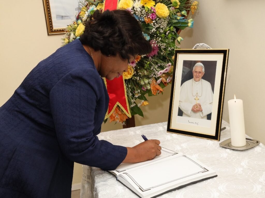 A Vice-Presidente da República, Esperança da Costa, rendeu na manhã desta quarta-feira [04 de Janeiro de 2023], na Nunciatura Apostólica da Santa Sé em Luanda, homenagem à Sua Santidade Papa Emérito Bento XVI, falecido sábado [31.12.2022] no Mosteiro Mater Eclesial, Cidade do Vaticano, vítima de doença.